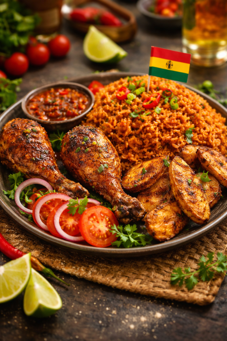 The undisputed champion of celebrations! Our rich, slightly smoky jollof rice, served with juicy, flame-grilled chicken. A true taste of Ghana.