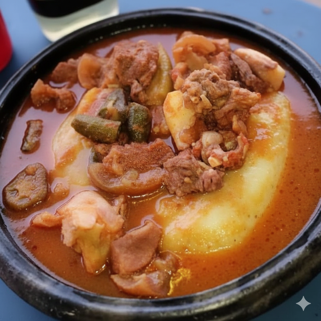The ultimate Ghanaian comfort food. Smooth, pillowy fufu (pounded cassava and plantain) is served alongside a light, aromatic, and peppery broth filled with tender goat meat. Designed to be eaten with your handsâpinch, dip, and savor.