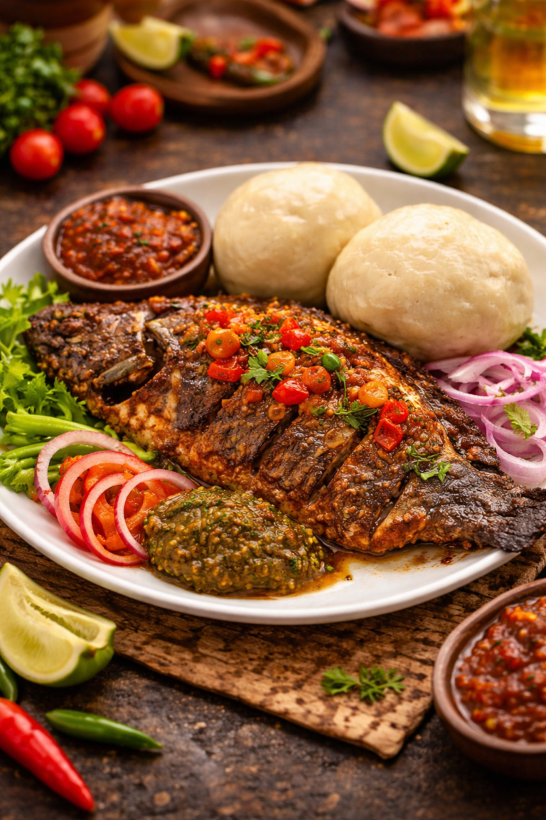 Freshly pounded banku (fermented corn/cassava dough) served with a whole, perfectly grilled tilapia, accompanied by a vibrant pepper-and-tomato salsa (shito or pepper sauce).
